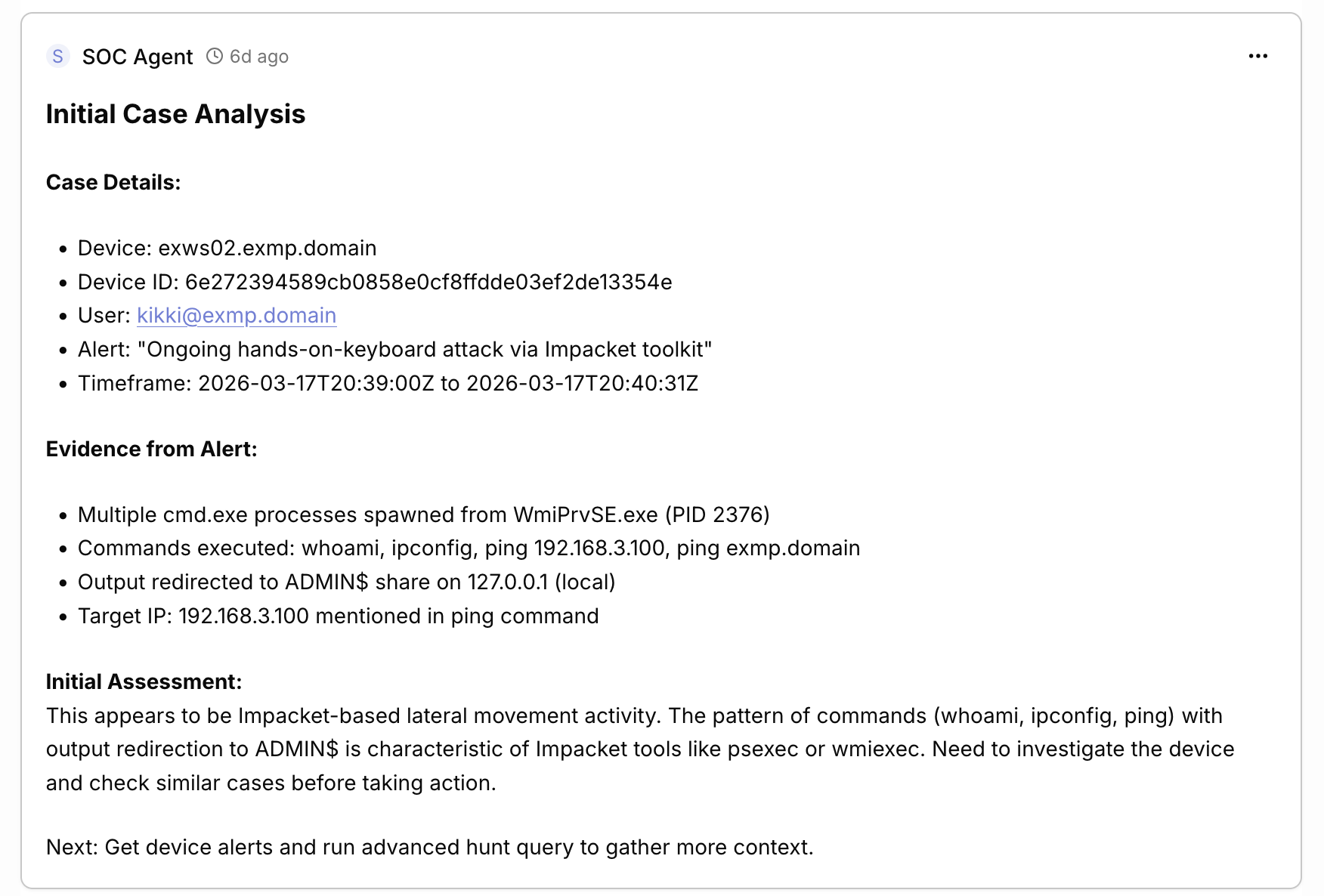 - Defender Alerts: Retrieved 5 alerts for device, including the high-severity Impacket alert