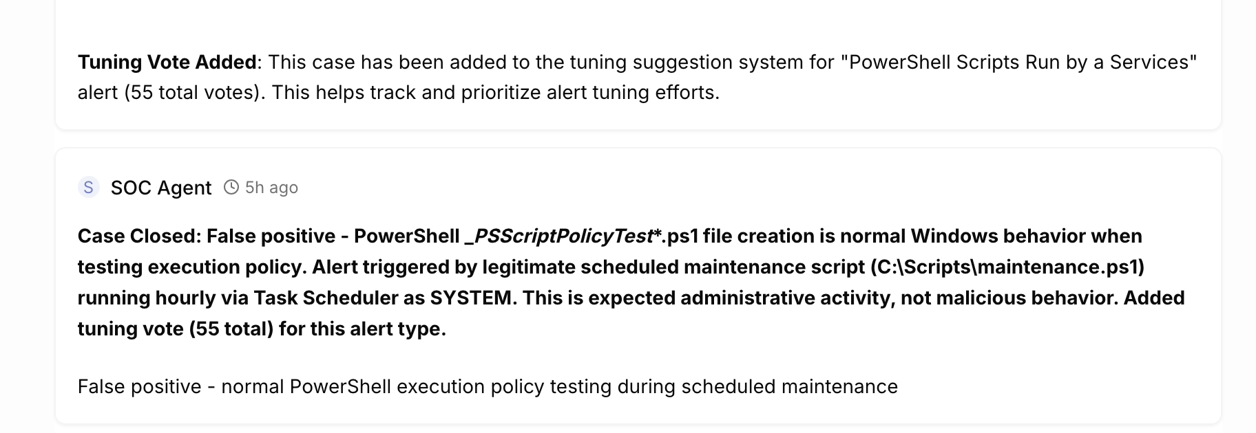 Oh! I also did a tuning tool where the AI can suggest tuning the alerts. It is a voting system so as the AI analyses the alerts and thinkgs something is FP it can vote for tuning it. There is a separate tuning statistics where individual suggestions can be seen and tuning can be “officially” started. It can also use this information when making analysis. Here is a picture how it looks like in the case notes: